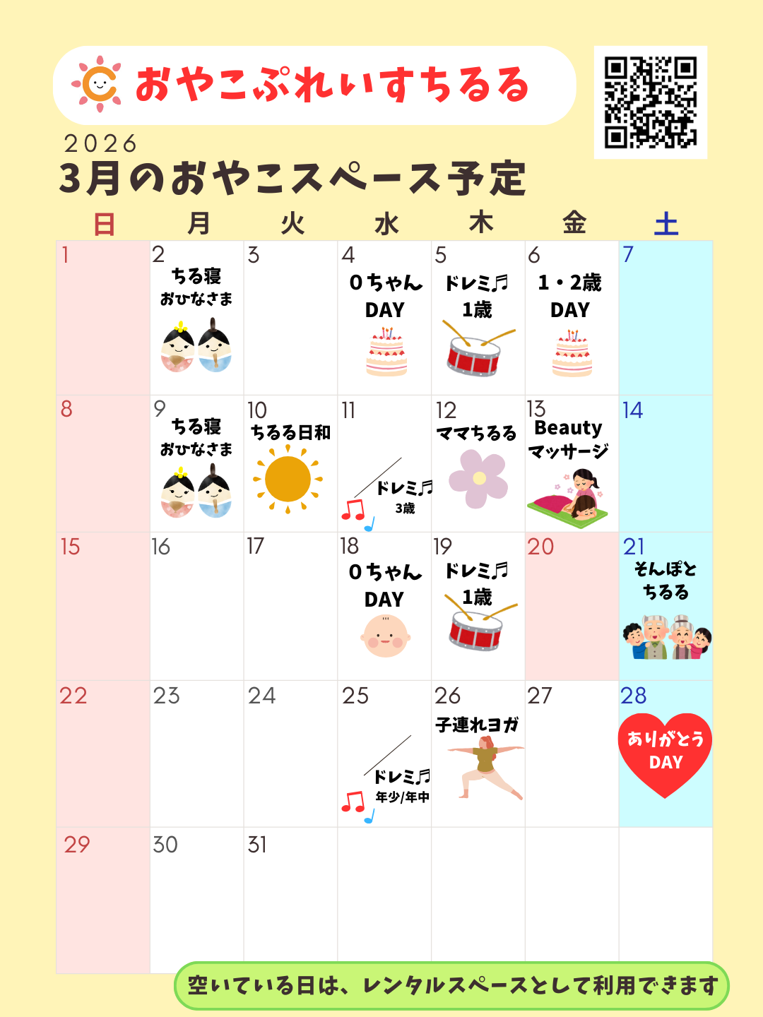 2026年3月の予定をお知らせします。気になるイベントの予約はお早めに!